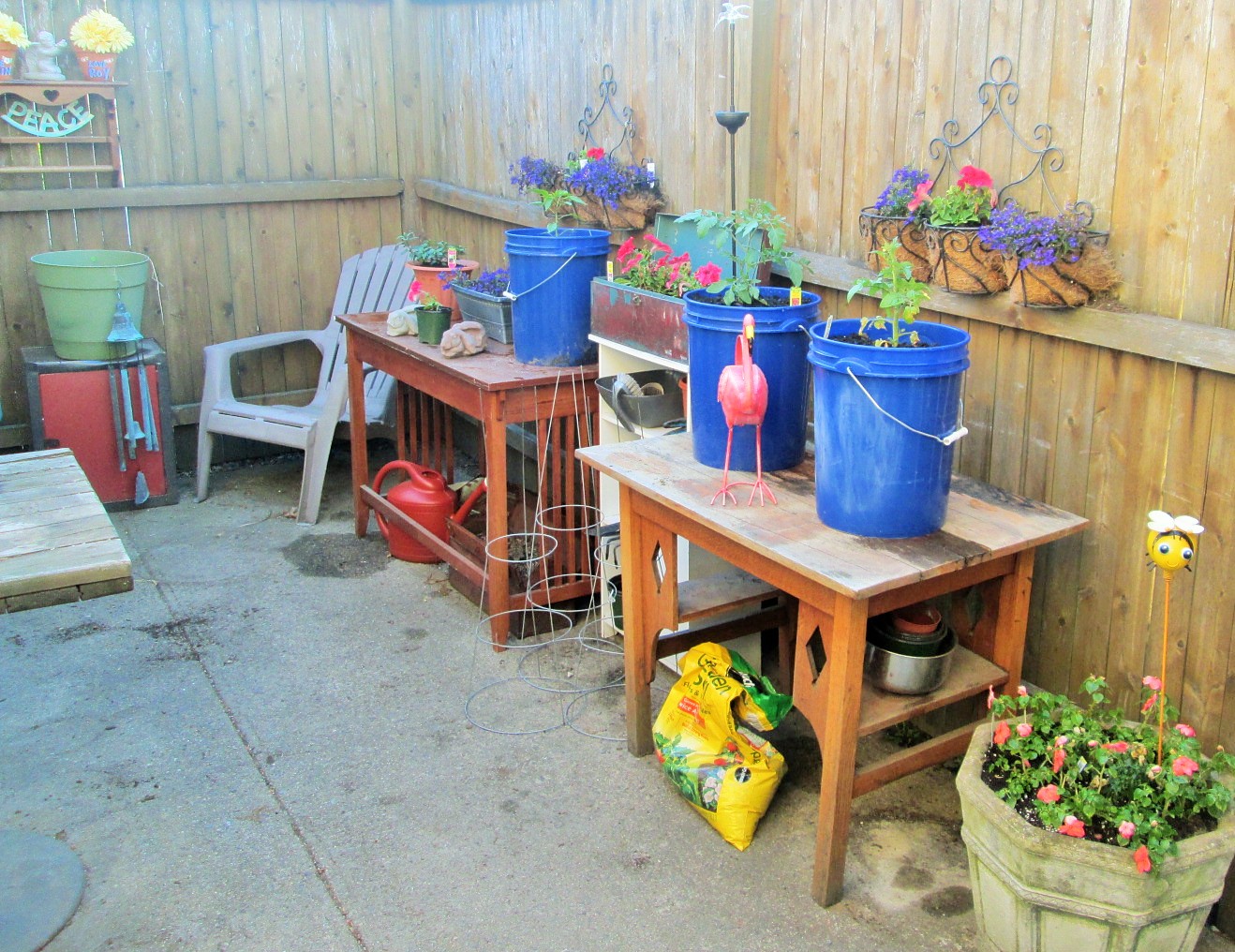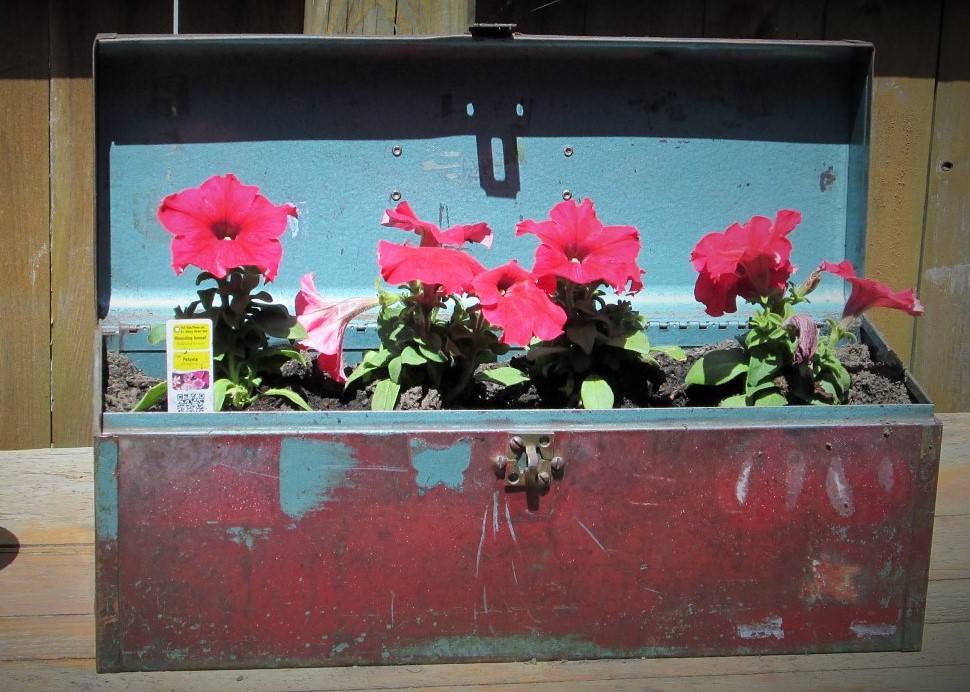 Repurposing is very earth-friendly, and the garden is a great place to make that happen. Here are photos of the toolbox we adapted into a planter, and the desks (no longer house-worthy) we used as garden tables.