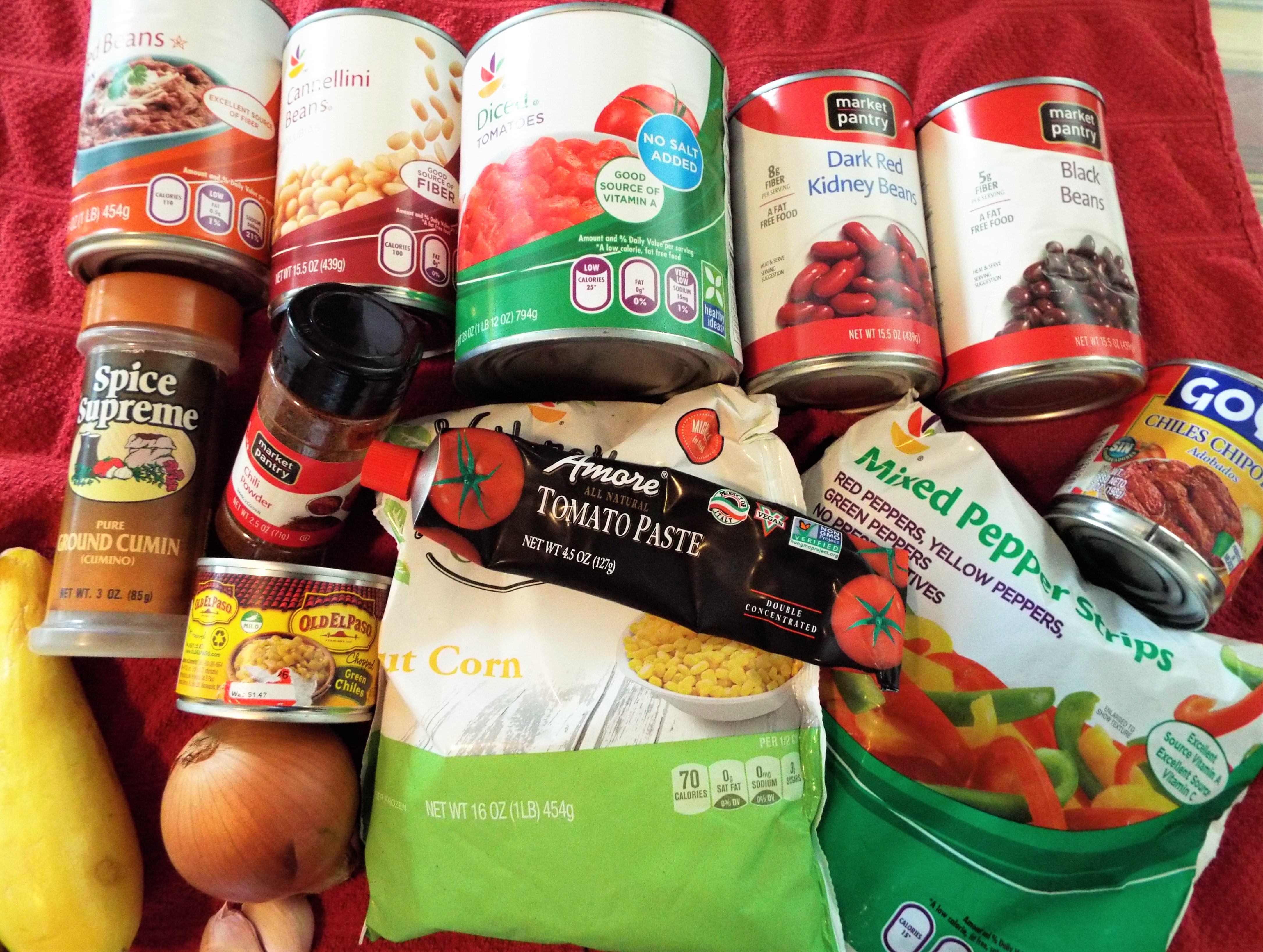 - two 15.5 oz. cans each of black beans, cannellini beans, red kidney beans, rinsed