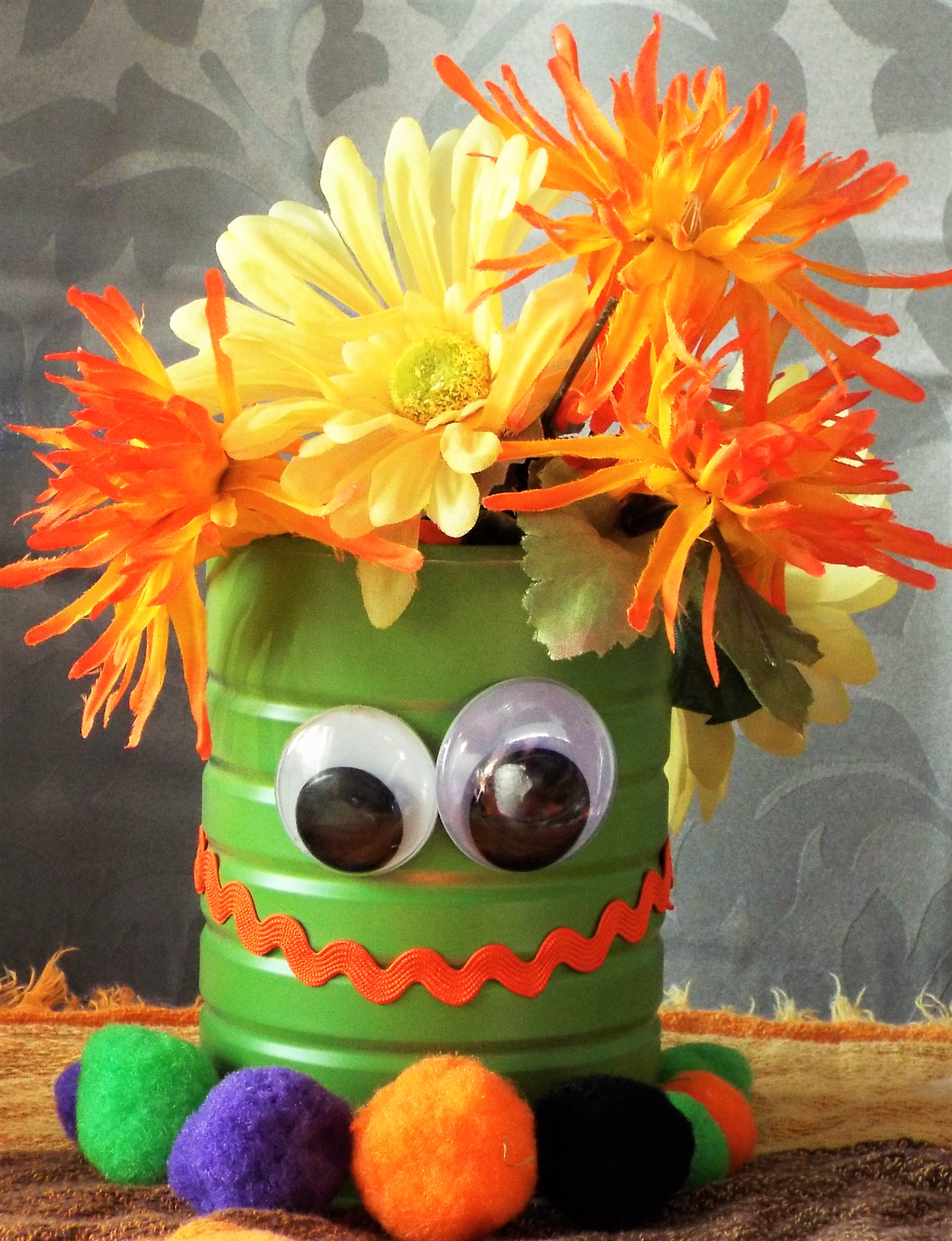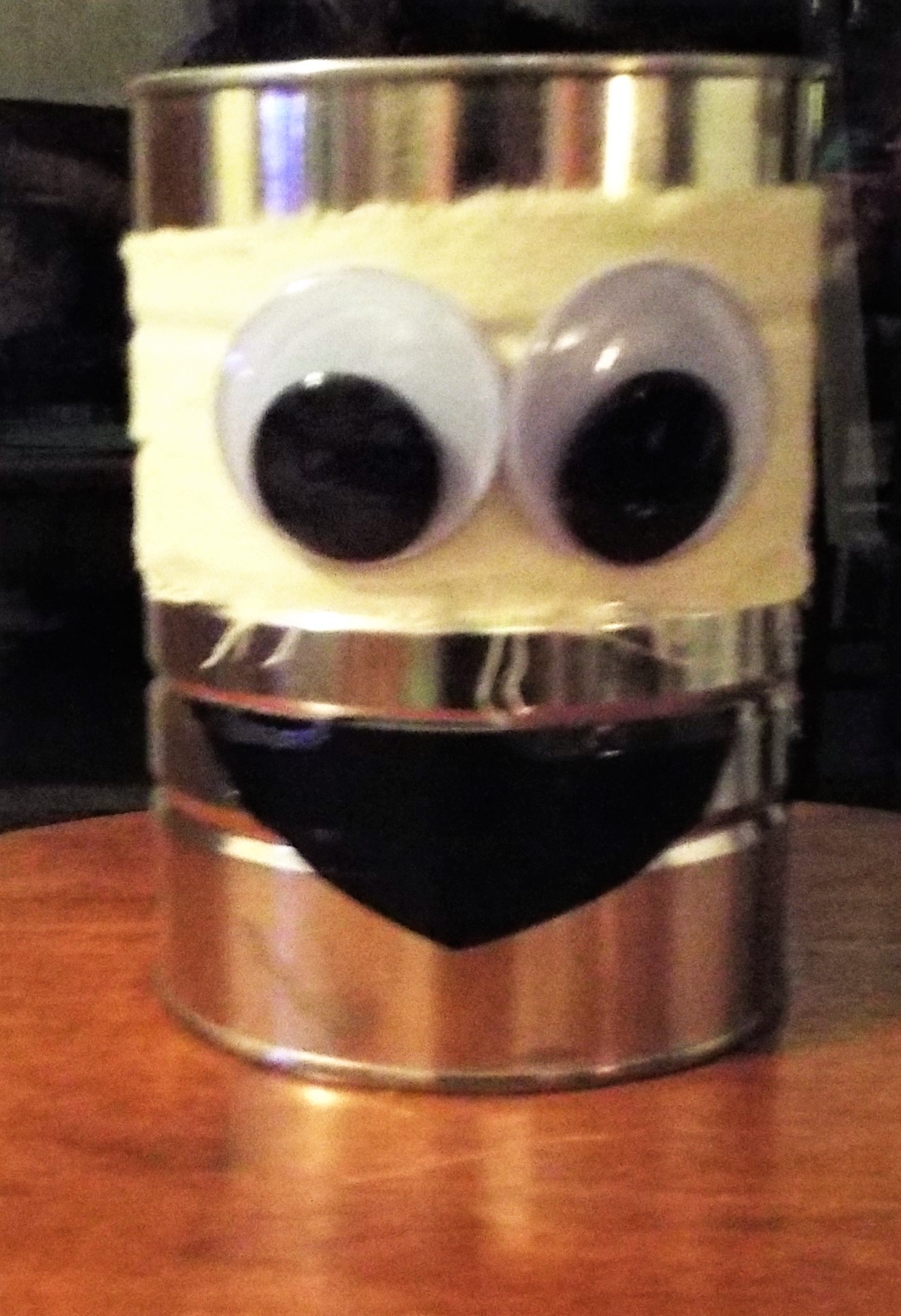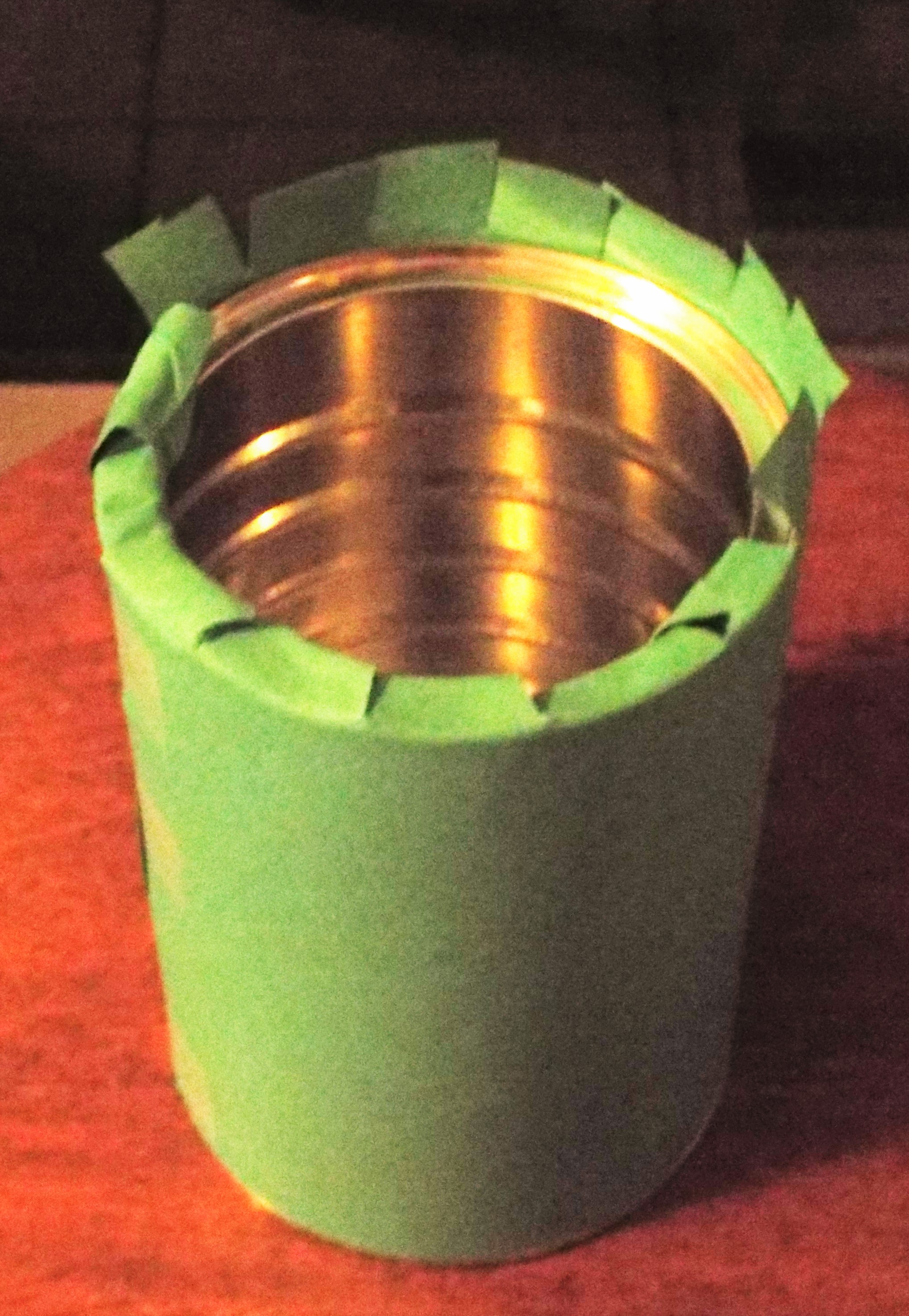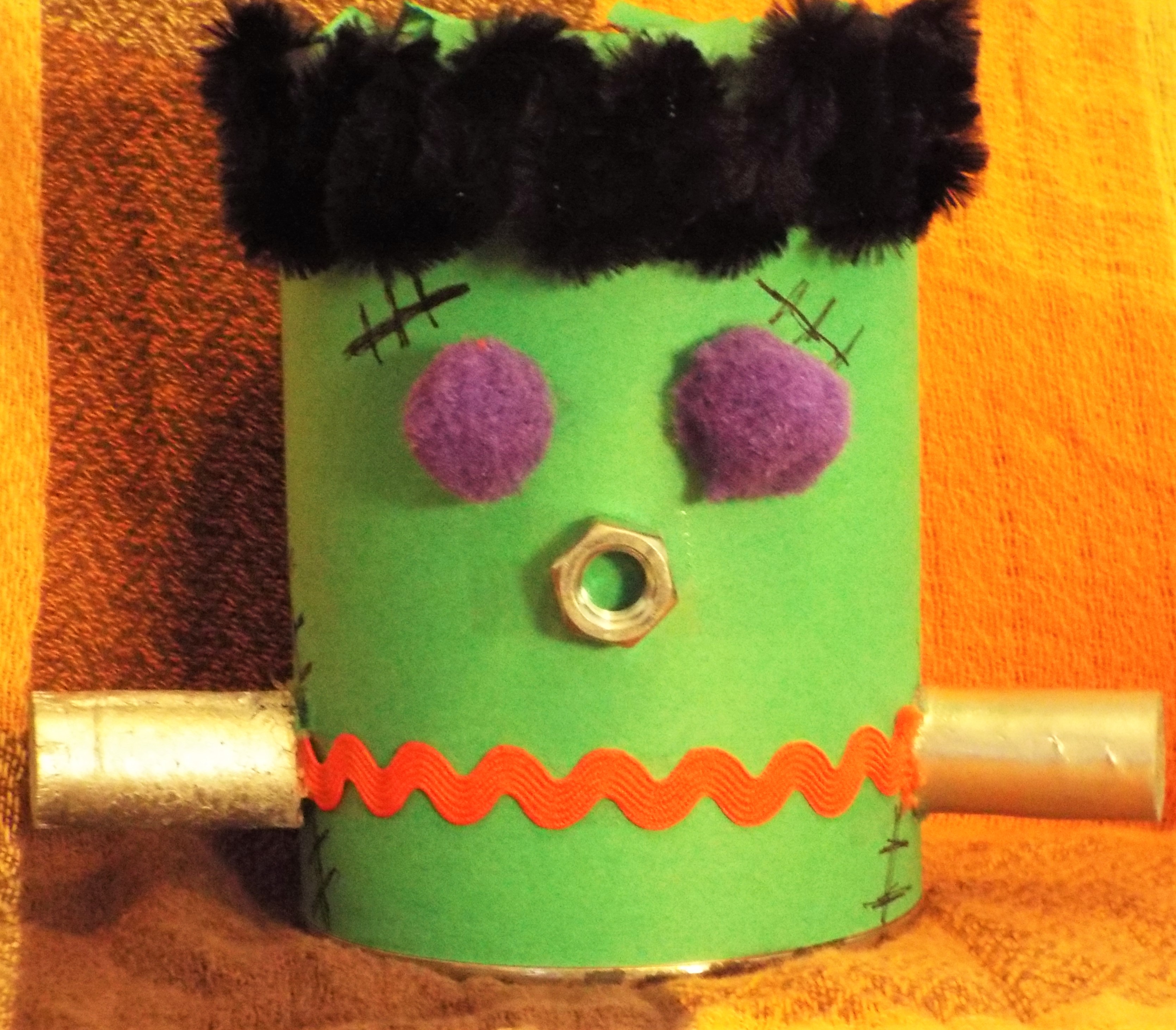 - For Frankenstein, we covered a can with construction paper. Allow at least one inch at the top of the can, cut slits and fold over top of can for a crisp fit.
