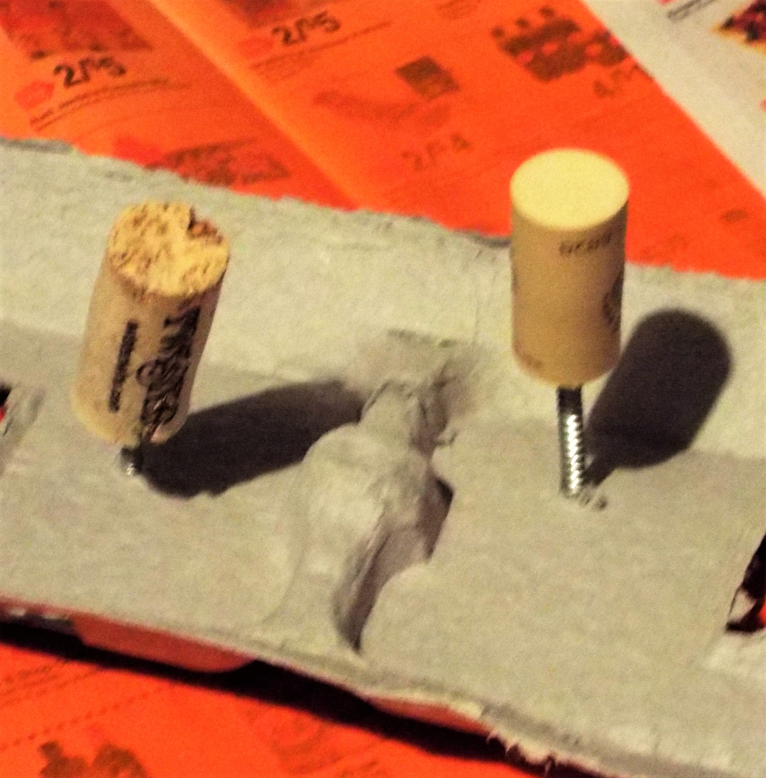 - Wine corks spray painted silver for the bolts. Paint the corks by securing them on a screw through a piece of cardboard or egg carton. Another, less kid-friendly option is to drill holes in the can and use real bolts!