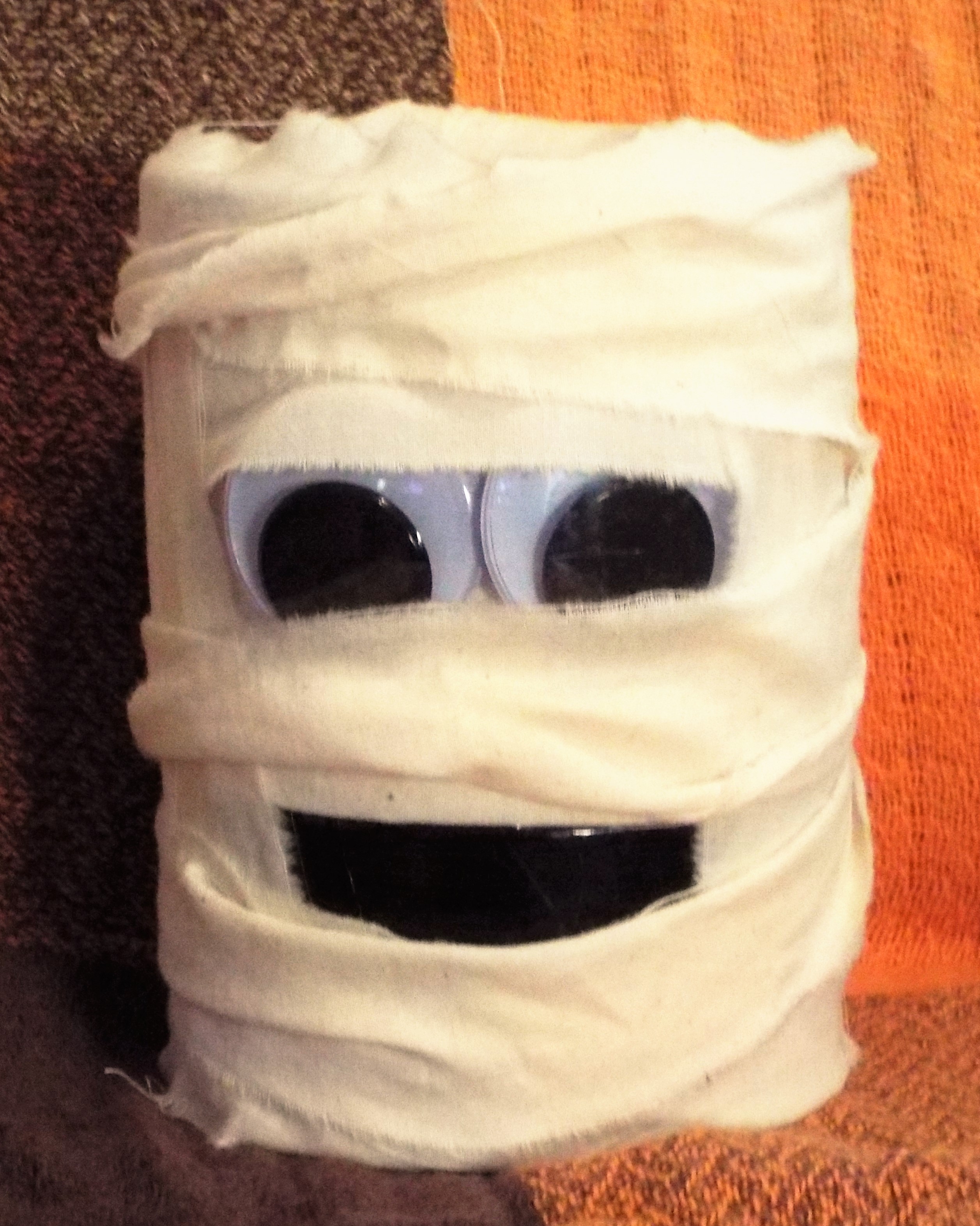 - Glue the eyes to the cloth and add mouth cut from black duct tape.