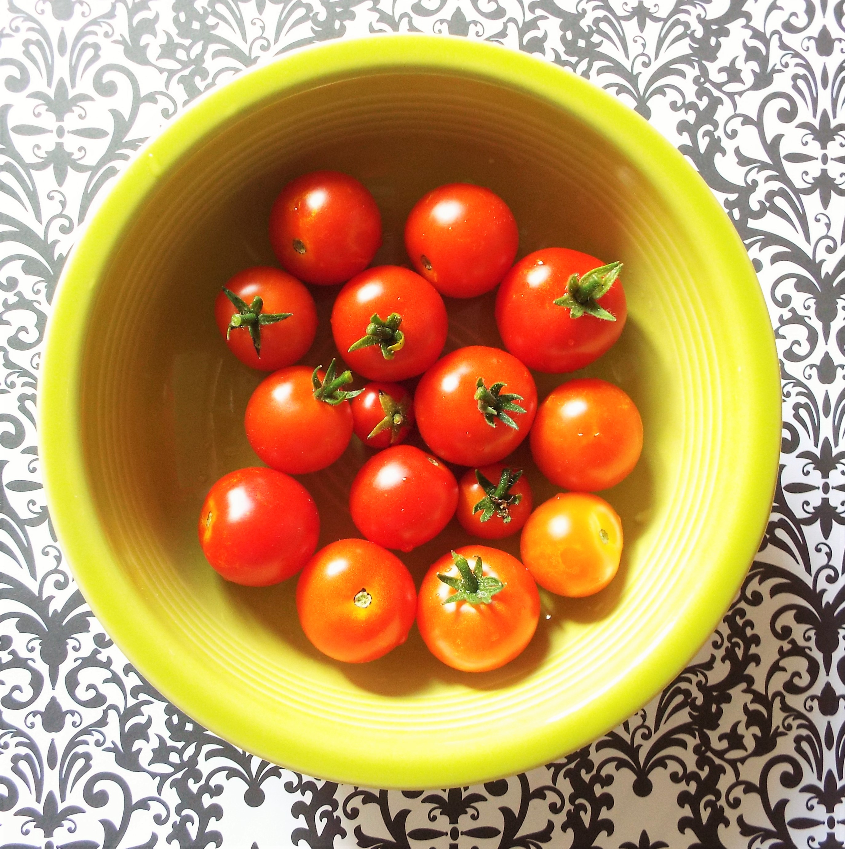 Our first crop of tomatoes (can you find all 15?) with a fun background.