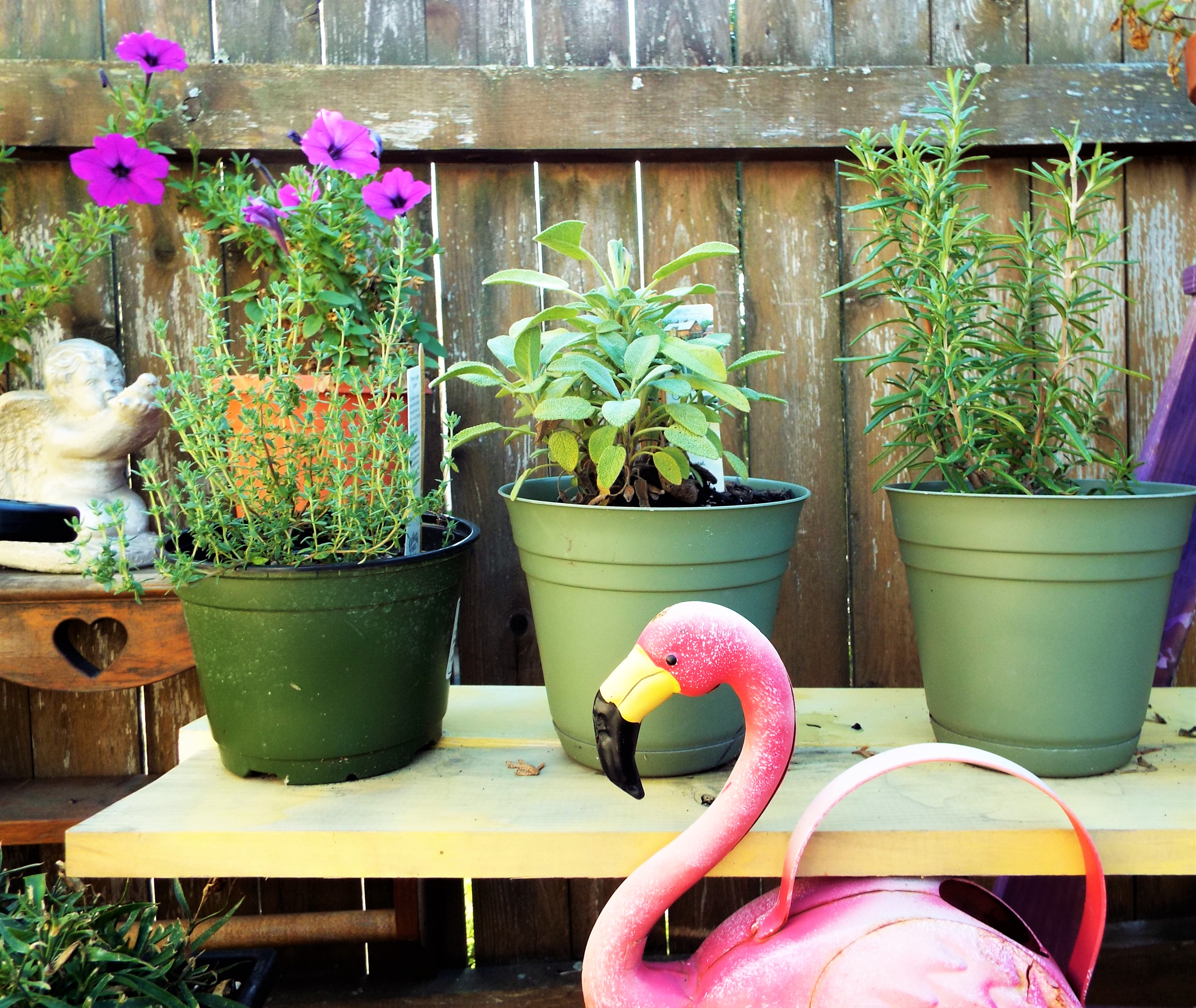 The herbs are doing well, too. The flamingo is impressed!